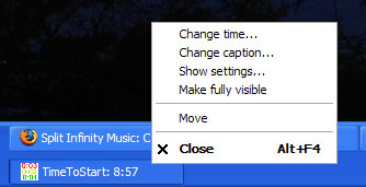 Other OptionsWhen you right-click the Windows Taskbar icon for TimeToStart, you will find a few convenient options in the context menu. This makes it easy to adjust TimeToStart's settings on-the-fly - without your audience seeing you work behind the scenes.The taskbar icon also shows the time remaining at all times - so you don't need to see the projection screen to know what's going on. |