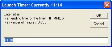Time Selection DialogWhen you first launch TimeToStart, you will be asked for the ending time. You can either specify the time remaining in minutes, or an actual clock time.TimeToStart is intelligent, too: it will automatically suggest times to the next reasonable 15-minute increment. Most of the time, you can just click OK. |
