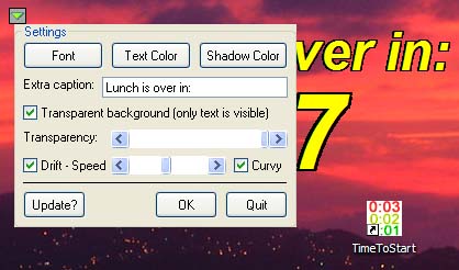 TransparencyTimeToStart supports transparency effects. When you use it over a background image, you can decide just how transparent the clock will appear. (This feature works best over static images.) |