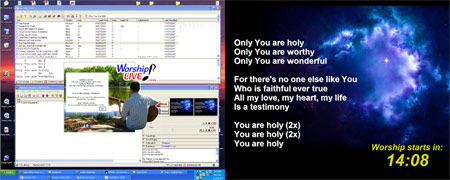 Dual Monitor SupportTimeToStart has true multi-monitor support. It will remember its position anywhere on the Windows extended desktop. It's perfect for use with digital projection systems, in large venues. It works with your existing software and hardware, and simply adds the countdown clock to whatever you're already doing. No fuss, no problem - just the timer function you need.(If you're looking for software to handle all your church worship planning and projection needs, consider our Worship LIVE! software.) |
