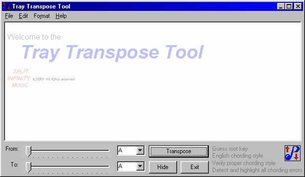 It's a small and quick application for Windows which resides in your system notification area (the "system tray"). Need to transpose a song?Copy the lyrics and chords of a song from whatever Windows program you use, click the tray icon, and up pops the Tray Transpose Tool, with the clipboard contents already shown. It'll even guess the root chord for you. Simply select a new key, click Transpose, and the clipboard will contain your freshly transposed song, ready to paste back into your own Windows programs. Since the Tray Transpose Tool supports rich (formatted) text, your own application's fonts, styles and colors are all preserved. The Tray Tranpose Tool also supports three different chording styles: The standard English style (A B C), the so-called Latin or Spanish style (Do Re Mi), and even the Nashville or jazz style (I II III). Conversions between the various formats are supported, and the Tray Transpose Tool can even automatically determine if you're importing a different format. No file or printer functions are included - we leave this up to your own software. Do you need something more potent? Try Worship LIVE!, with all of Tray Transpose Tool's transposition features, but much more - including full song databasing, printing, projection, and playList capabilities for comprehensive worship planning. Features